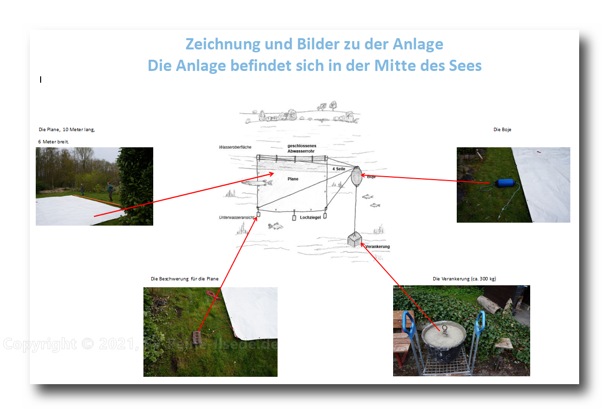 Vorhang Bild ThumbEs wird der See im Vorfeld in Abständen hinsichtlich Temperatur und Sauerstoffgehalt vermessen, um die Schichtung des Wassers festzustellen und dann an derVorhang Bilder und Skizze Thumb optimalen Position einen Vorhang einbringen zu können, damit eine Sprungschicht vermieden wird und für eine Verteilung des Sauerstoffs führt.